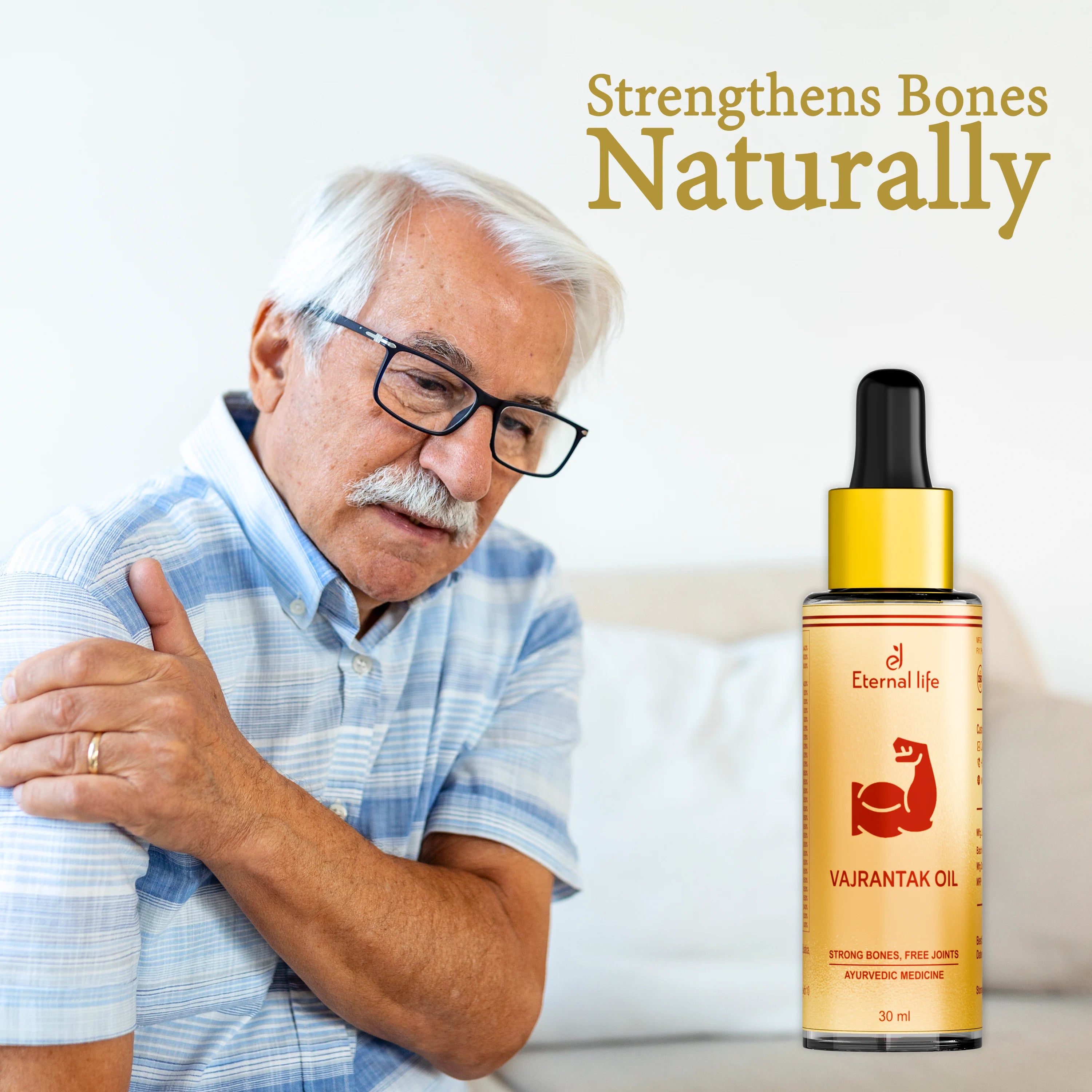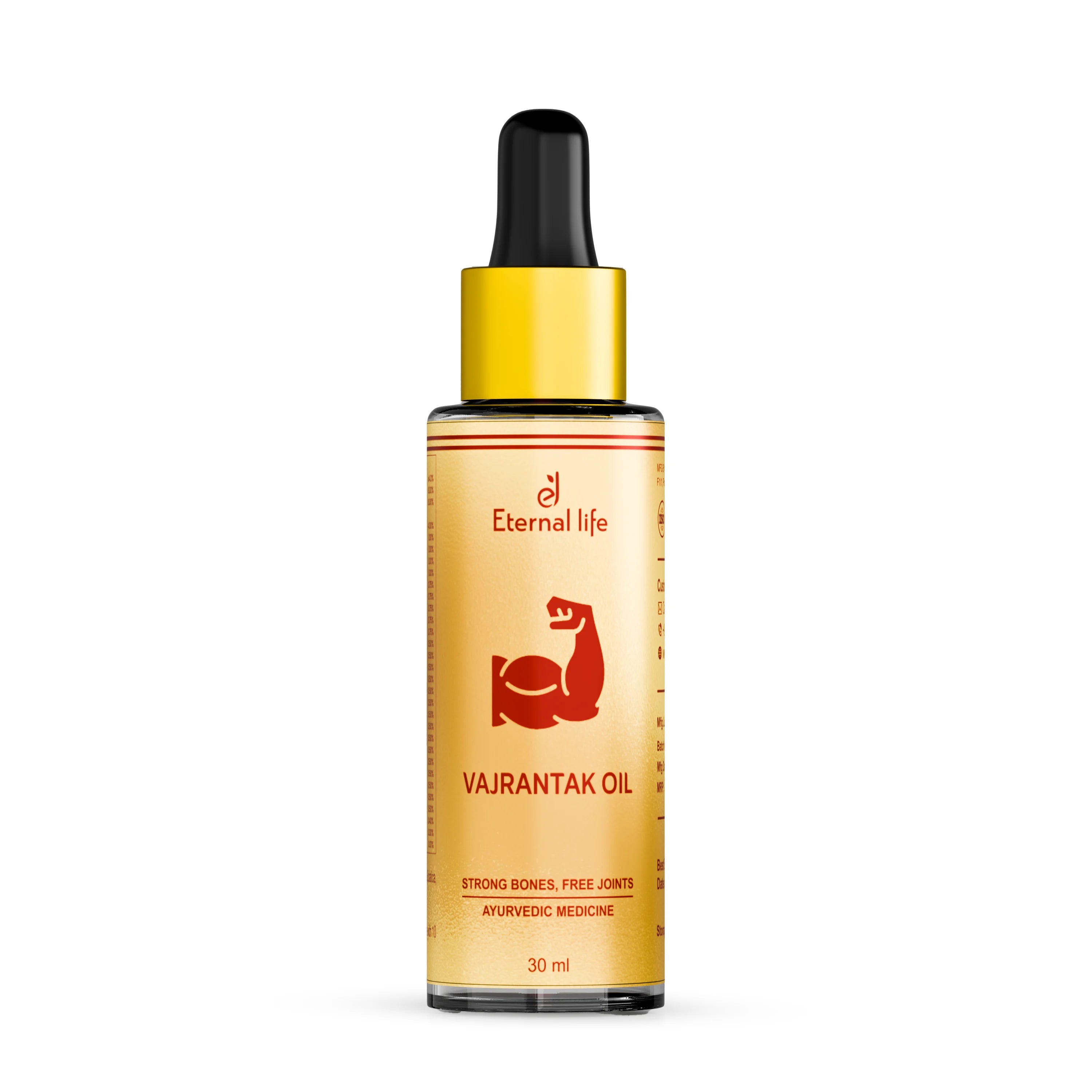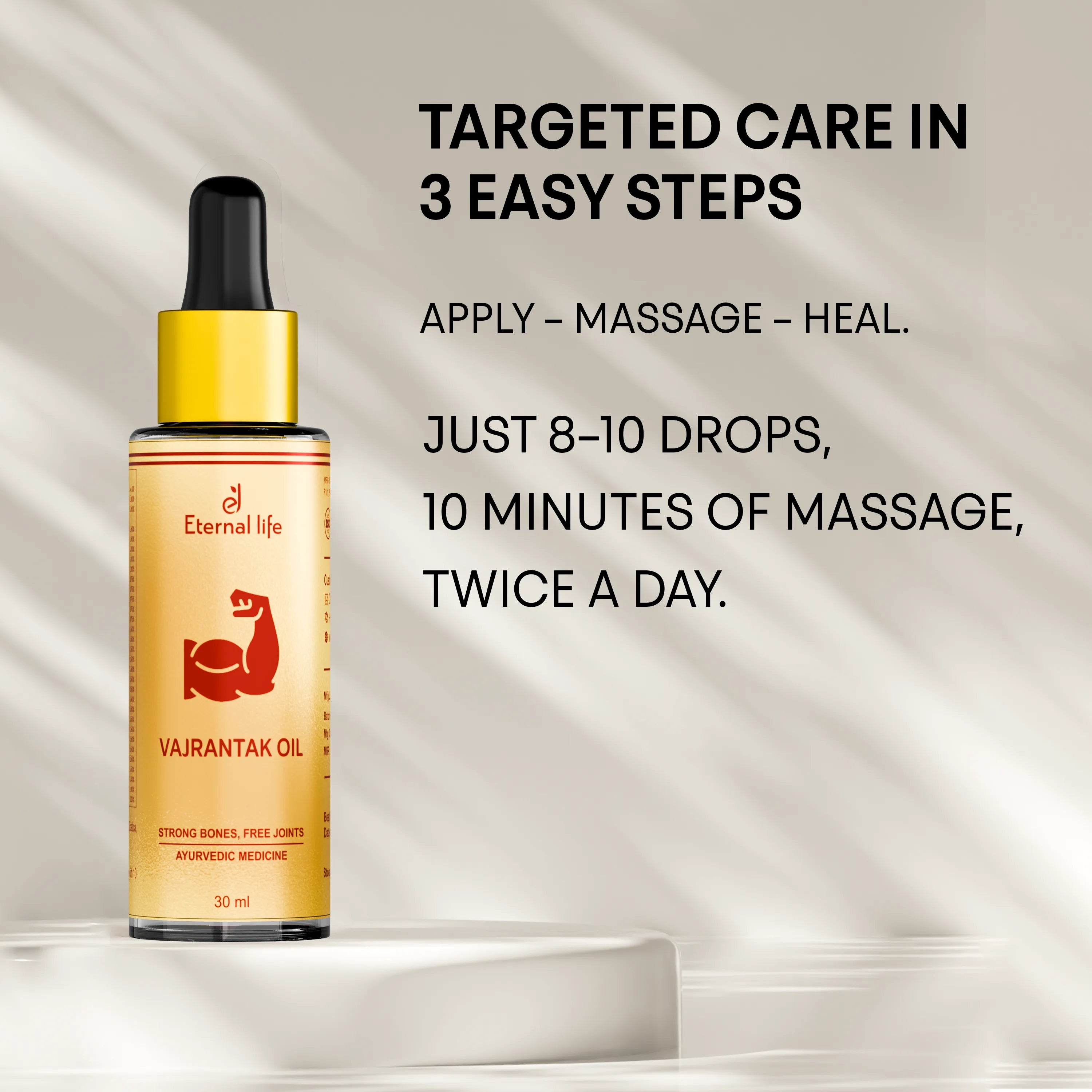 इटरनल लाइफ वज्रान्तक तेल से जकड़न और जोड़ों के दर्द को कम करें। गठिया से राहत, प्राकृतिक उपचार और ऑस्टियोपोरोसिस के लिए आयुर्वेदिक मालिश तेल। 30ml पैक।