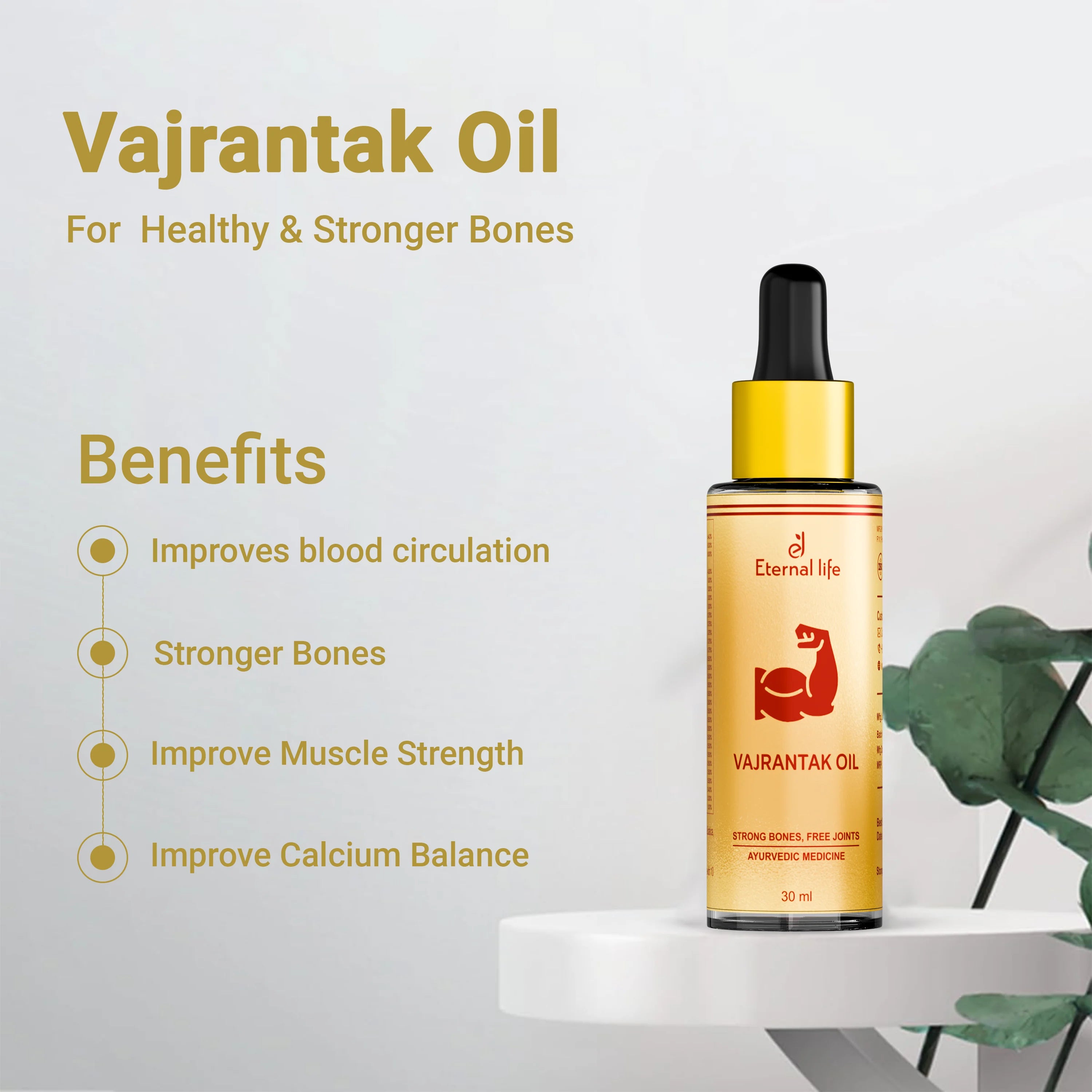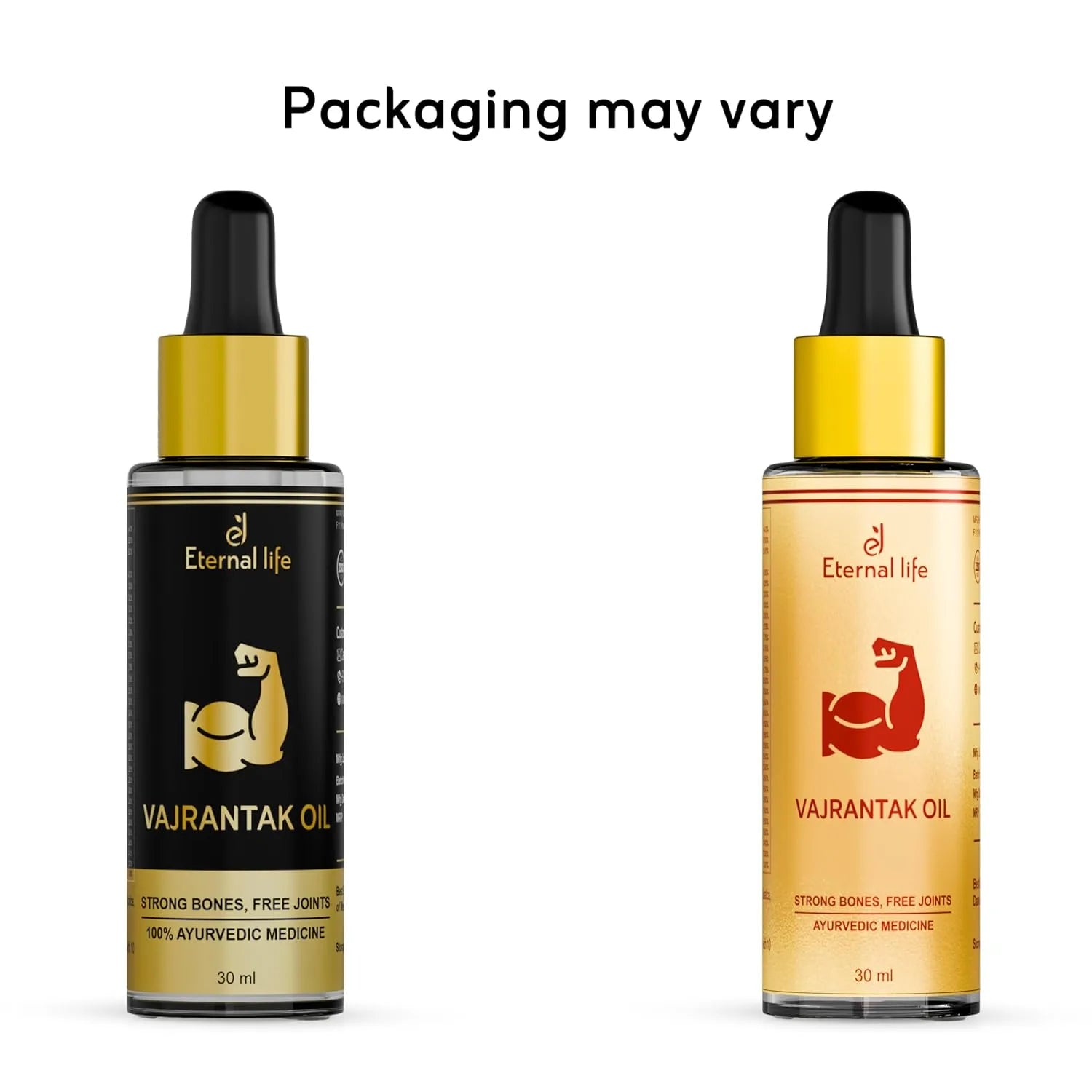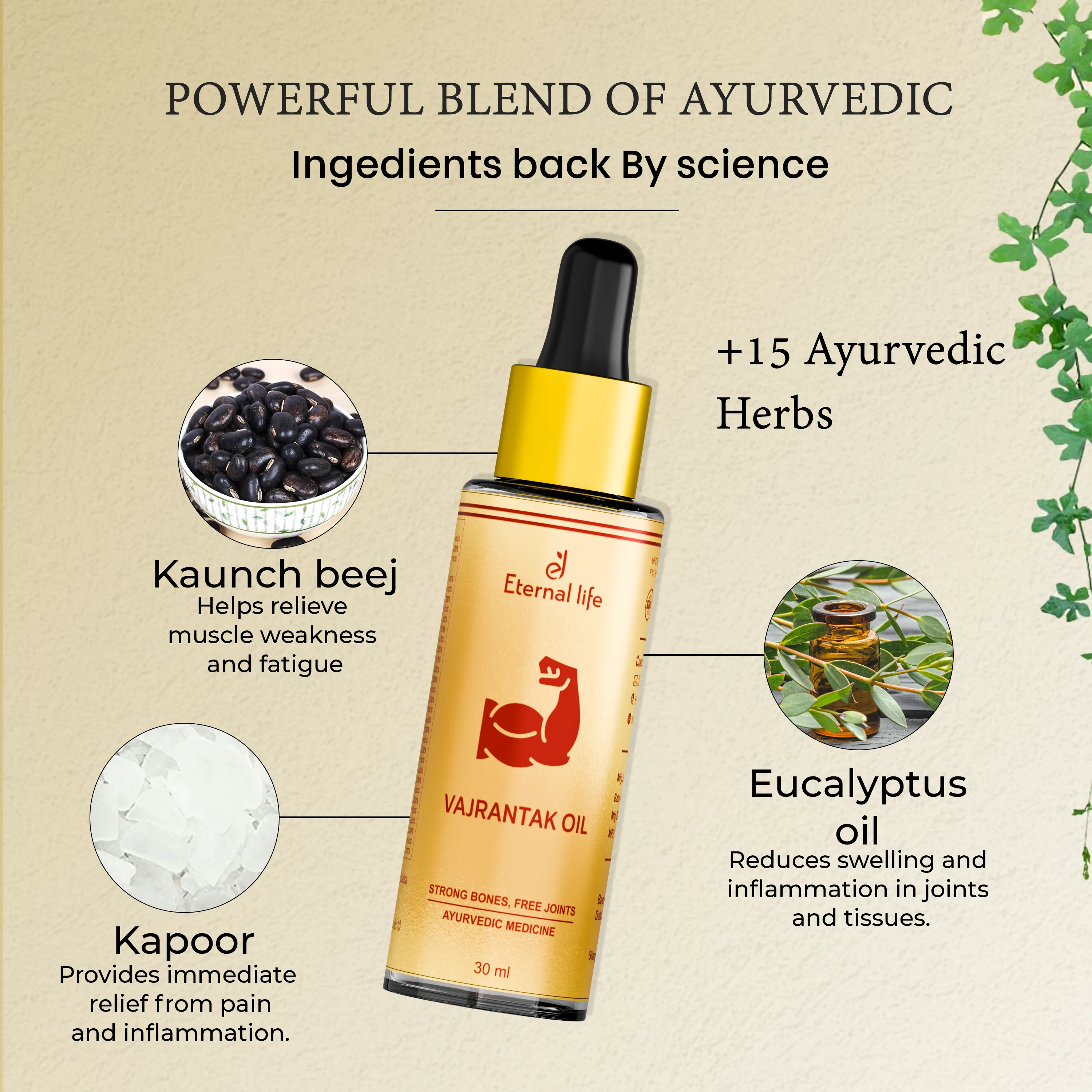 इटरनल लाइफ वज्रान्तक तेल से जकड़न और जोड़ों के दर्द को कम करें। गठिया से राहत, प्राकृतिक उपचार और ऑस्टियोपोरोसिस के लिए आयुर्वेदिक मालिश तेल। 30ml पैक।